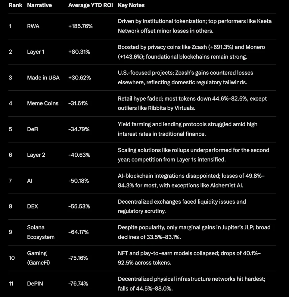 Compared to 2024, the narrative landscape of 2025 looks dramatically different. Last year’s top performers — particularly AI and memecoins — reversed course sharply, while previously overlooked sectors surged ahead.